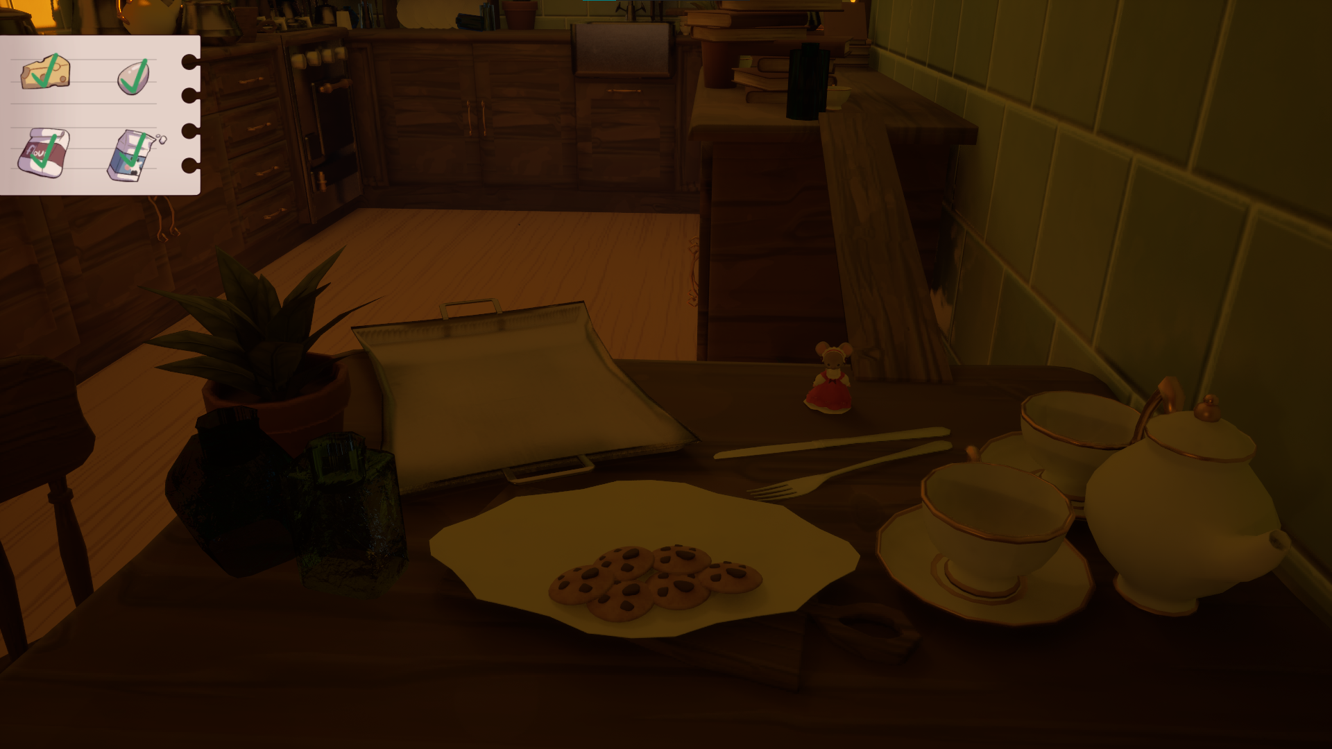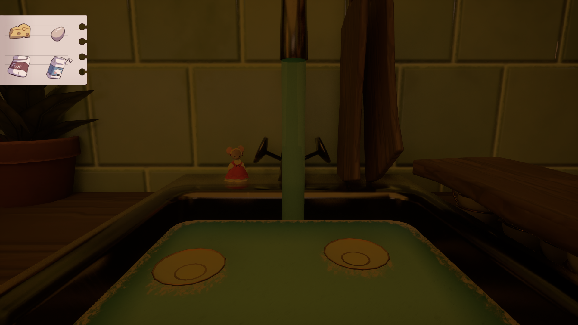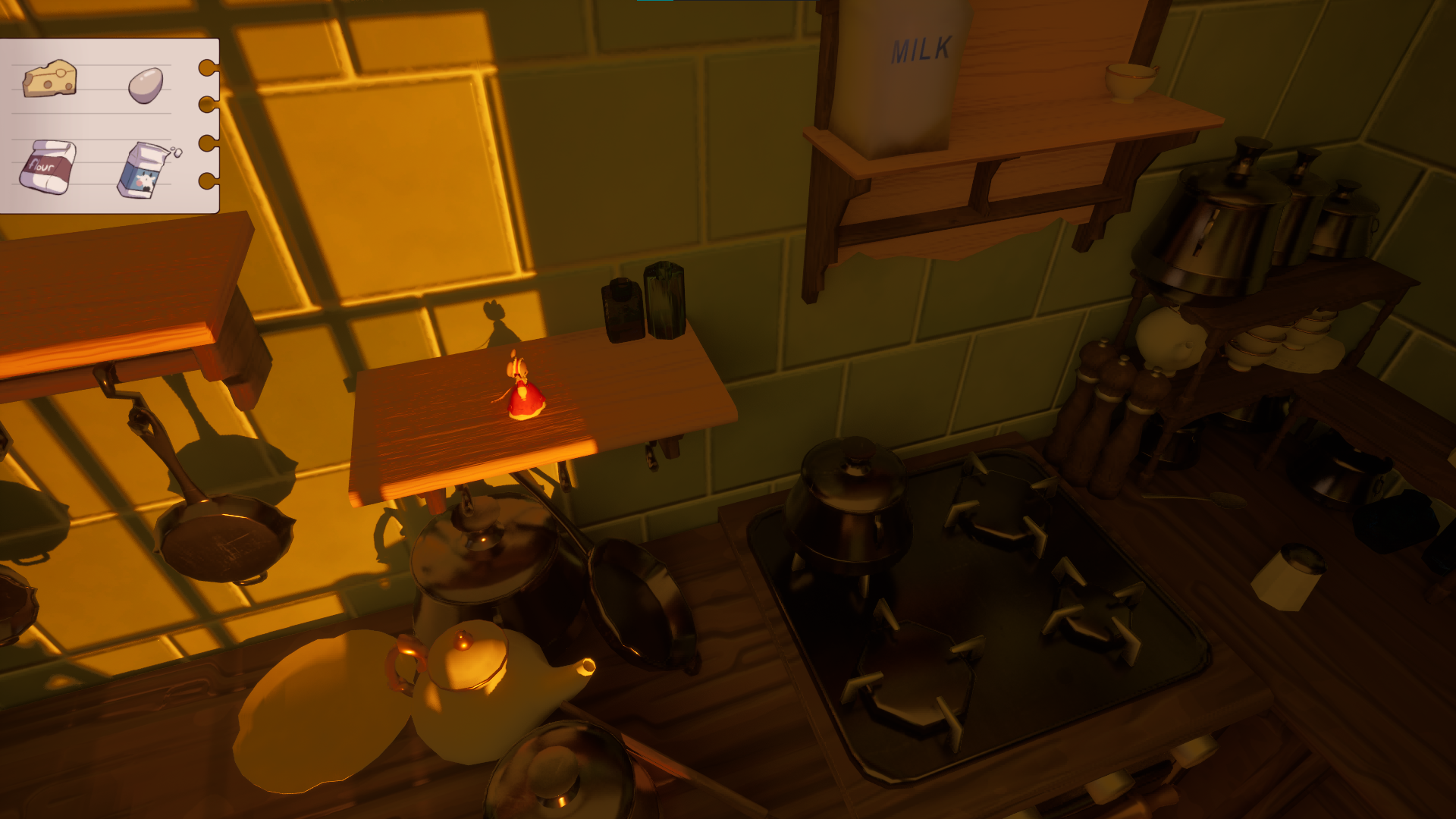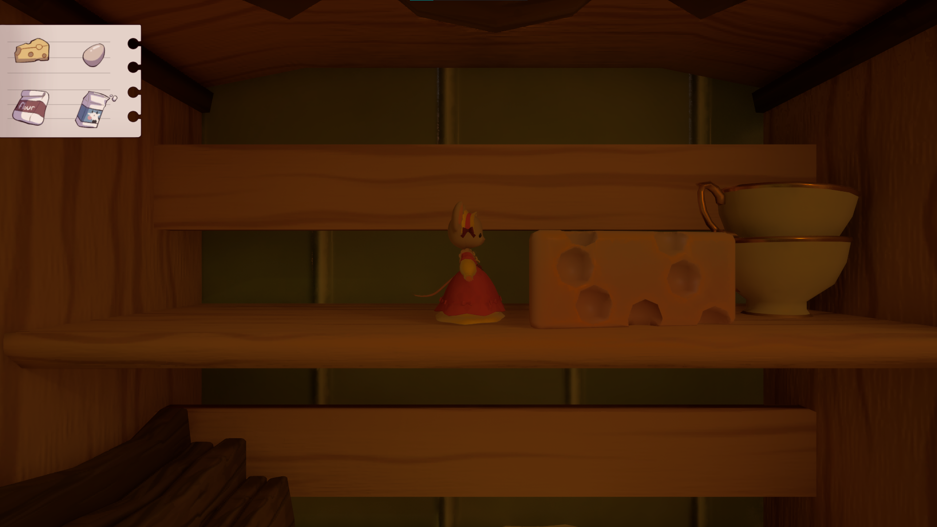 In this 3D platformer, you'll play as a little mouse that wants to bake a cheese cake for her grandmother's birthday! Explore a giant but cozy kitchen to find all the ingredients. But careful, its not always easy to get around being so small. Find a way through the kitchen by pushing and dragging some of the objects in your way!